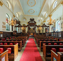 In the century following the English Reformation newly built Anglican churches were invariably fitted with chancel screens, which served the purpose of differentiating a separate space in the chancel for communicants at Holy Communion, as was required in the newly adopted Book of Common Prayer.[22] In effect, these chancel screens were rood screens without a surmounting loft or crucifix, and examples survive at St John Leeds and at Foremark. New screens were also erected in many medieval churches where they had been destroyed at the Reformation, as at Cartmel Priory and Abbey Dore. From the early 17th century it became normal for screens or tympanums to carry the Royal Arms of England, good examples of which survive in two of the London churches of Sir Christopher Wren, and also at Derby Cathedral. However, Wren's design for the church of St James, Piccadilly of 1684 dispensed with a chancel screen, retaining only rails around the altar itself, and this auditory church plan was widely adopted as a model for new churches from then on.[23] In the 18th and 19th centuries hundreds of surviving medieval screens were removed altogether; today, in many British churches, the rood stair (which gave access to the rood loft) is often the only remaining trace of the former rood loft and screen.