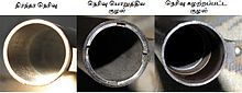 For shotguns with fixed chokes integral to the barrel, it is sometimes still possible to change the choke to a tighter choke. This is done by increasing the diameter of the bore inside the barrel for a short length of barrel, while the portion of the barrel and bore nearest the muzzle is left as it was. The effect is to form what is called a "jug choke" or a "reverse choke".[11] This method is sometimes used by gunsmiths to implement a tighter choke on an existing gun without replaceable chokes, and can be done without requiring replacement of a barrel and without installing new screw-in replaceable chokes. Advantages claimed for a "jug choke" include improved patterns, reduction of recoil, and an increase of choke in a shotgun that does not have replaceable choke tubes. When a "jug choke" is implemented in an existing choked barrel, the bore inside the bored-out section of barrel effectively becomes "overbored", and this also typically lessens the amount of shot deformation, thereby increasing the shot pattern density.[6]