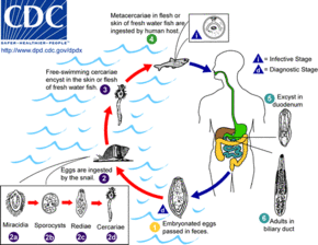 - ^ Sripa B, Kaewkes S, Intapan PM, Maleewong W, Brindley PJ (2010). Food-borne trematodiases in Southeast Asia epidemiology, pathology, clinical manifestation and control. Advances in Parasitology. 72. pp. 305–50. doi:10.1016/S0065-308X(10)72011-X. ISBN 9780123815132. PMID 20624536.