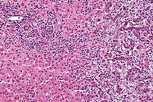 | Micrograph of an intrahepatic cholangiocarcinoma (right of image) adjacent to normal liver cells (left of image). H&E stain. | |