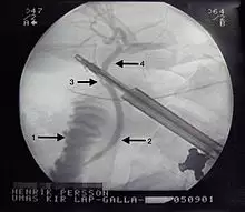 In recent years the LERV technique, in which access to the common bile duct by ERCP is facilitated by an antegrade guidewire, which is intraoperatively introduced during fluoroscopy and is advanced through the cystic duct to the duodenum, has been established as an alternative to treat common bile duct stones discovered during laparoscopic cholecystectomy. This technique was first described in 1993 by Deslandres et al.[29] and has, in several studies, been shown to have a high rate of CBD stones clearance and a reduced number of complications, particularly post-ERCP pancreatitis, in comparison with conventional ERCP.[30][31] This is probably due to the facilitated access to the common bile duct with a lesser degree of manipulation and trauma to the papilla Vateri. In a study by Swahn et al. the rendezvous method was shown to reduce the risk of PEP from 3.6-2.2% compared with conventional biliary cannulation.[32] The success rate of passing the transcystic guidewire into the duodenum has been reported to be over 80%.[33]
