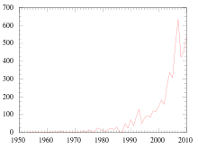 Everest's first known summiting occurred by 1953, and interest by climbers increased.[87] Despite the effort and attention poured into expeditions, only about 200 people had sumitted by 1987.[87] Everest remained a difficult climb for decades, even for serious attempts by professional climbers and large national expeditions, which were the norm until the commercial era began in the 1990s.[88]