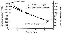 One of the issues facing climbers is the frequent presence of high-speed winds.[81] The peak of Mount Everest extends into the upper troposphere and penetrates the stratosphere,[82] which can expose it to the fast and freezing winds of the jet stream.[83] In February 2004, a wind speed of 280 km/h (175 mph) was recorded at the summit and winds over 160 km/h (100 mph) are common.[81] These winds can blow climbers off Everest. Climbers typically aim for a 7- to 10-day window in the spring and fall when the Asian monsoon season is either starting up or ending and the winds are lighter. The air pressure at the summit is about one-third what it is at sea level, and by Bernoulli's principle, the winds can lower the pressure further, causing an additional 14 percent reduction in oxygen to climbers.[83] The reduction in oxygen availability comes from the reduced overall pressure, not a reduction in the ratio of oxygen to other gases.[84]