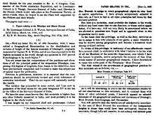In 1852, stationed at the survey headquarters in Dehradun, Radhanath Sikdar, an Indian mathematician and surveyor from Bengal was the first to identify Everest as the world's highest peak, using trigonometric calculations based on Nicolson's measurements.[28] An official announcement that Peak XV was the highest was delayed for several years as the calculations were repeatedly verified. Waugh began work on Nicolson's data in 1854, and along with his staff spent almost two years working on the numbers, having to deal with the problems of light refraction, barometric pressure, and temperature over the vast distances of the observations. Finally, in March 1856 he announced his findings in a letter to his deputy in Calcutta. Kangchenjunga was declared to be 8,582 m (28,156 ft), while Peak XV was given the height of 8,840 m (29,002 ft). Waugh concluded that Peak XV was "most probably the highest in the world".[19] Peak XV (measured in feet) was calculated to be exactly 29,000 ft (8,839.2 m) high, but was publicly declared to be 29,002 ft (8,839.8 m) in order to avoid the impression that an exact height of 29,000 feet (8,839.2 m) was nothing more than a rounded estimate.[29] Waugh is sometimes playfully credited with being "the first person to put two feet on top of Mount Everest".[30]