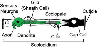 In the femoral chordotonal organ, the scolopidia are organized into groups called scoloparia. Scoloparia may be functionally distinct from one another, with separate scoloparia containing vibration-sensitive or position-sensitive sensory neurons.[17][18] D. melanogaster has three scoloparia.[19]