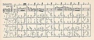 The word choreography literally means "dance-writing" from the Greek words "χορεία" (circular dance, see choreia) and "γραφή" (writing). It first appeared in the American English dictionary in the 1950s,[1] and "choreographer" was first used as a credit for George Balanchine in the Broadway show On Your Toes in 1936.[2] Before this, stage credits and movie credits used phrases such as "ensembles staged by",[3] "dances staged by",[4] or simply "dances by" to denote the choreographer.[2]