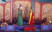 Khosrow and Shirin (Persian: خسرو و شیرین) is the title of a famous tragic romance by the Persian poet Nizami Ganjavi (1141–1209), who also wrote Layla and Majnun. It tells a highly elaborated fictional version of the story of the love of the Sasanian king Khosrow II for the Armenian princess Shirin, who becomes queen of Persia.[1][2][3][4] The essential narrative is a love story of Persian origin which was already well known from the great epico-historical poem the Shahnameh and other Persian writers and popular tales, and other works have the same title.[5]