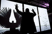 In 2012, Milk created "The Treachery of Sanctuary", an interactive immersive art installation currently touring the world with The Creators Project.[35] It is a large-scale interactive installation that utilizes the Microsoft Kinect to project and manipulate a participant's shadow onto a triptych. In the first panel, shadows of birds congregate to form the participant's shadow. In the second panel, the participant's shadow is torn apart by the birds. In the third, the participant's shadow sprouts wings, allowing the shadow to fly out of the frame as the participant flaps their arms. The triptych created a cycle that according to Milk interprets the universal human experience of birth, death and transfiguration.[36] "The Treachery of Sanctuary" was exhibited at the Onassis Cultural center in Greece,[37] and was selected to be a part of the Sundance Film Festival's New Frontier exhibition in January 2016.[38]