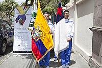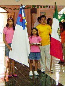 The flag has a white field, with a red Latin cross inside a blue canton. The shade of red on the cross symbolizes the blood that Jesus shed on Calvary.[12] The blue represents the waters of baptism as well as the faithfulness of Jesus.[13] The white represents Jesus' purity.[14] The dimensions of the flag and canton have no official specifications.