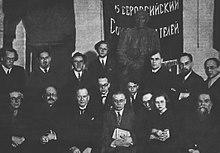 Rakovsky moved to Petrograd (the new name of Saint Petersburg) in the spring of 1917.[44] His anti-war activism almost got him arrested; Rakovsky managed to flee in August, and was present in Stockholm for the Third Zimmerwald Conference; he remained there and, with Karl Radek, issued propaganda material in support of the Russian revolutionaries.[54] Present in the internationalist faction of the Mensheviks, he joined the Bolsheviks in December 1917 or early 1918, after the October Revolution[54] (although he was occasionally listed among the Old Bolsheviks).[57] Rakovsky later stated that he had friendly relations with the Bolsheviks from early autumn 1917, when, during the attempted putsch of Lavr Kornilov, he was hidden by these in Sestroretsk.[6]