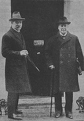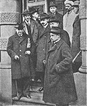 Rakovsky secretly returned to Romania in 1911, giving himself up in Bucharest.[6] According to Rakovsky, he was again expelled, holding a Romanian passport, to Istanbul, where he was swiftly arrested by the Young Turks government but released soon after.[6] He subsequently left for Sofia, where he established the Bulgarian socialist journal Napred.[6] Ultimately, the new Petre P. Carp Conservative cabinet agreed to allow his return to Romania, following pressures from the French Premier Georges Clemenceau (who answered an appeal by Jean Jaurès).[2] According to Rakovsky, this was also determined by the Conservative change in policies towards the peasantry.[6] He unsuccessfully ran for Parliament during the elections of that year (and several others in succession),[16] being fully reinstated as a citizen in April 1912.[6] Romanian journalist Stelian Tănase contends that the expulsion had instilled resentment in Rakovsky;[38] earlier, the leading National Liberal politician Ion G. Duca himself had argued that Rakovsky was developing a "hatred for Romania".[39]