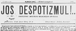 Rakovsky was drawn into a polemic with the Romanian authorities, facing public accusations that, as a Bulgarian, he lacked patriotism;[15] in return, he commented that, if patriotism meant "race prejudice, international and civil war, political tyranny and plutocratic domination", he refused to be identified with it.[26] Upon the outbreak of Romanian Peasants' Revolt of 1907, Rakovsky was especially vocal: he launched accusations at the National Liberal government, arguing that, having profited from the early antisemitic message of the revolt, it had violently repressed it from the moment peasants began to attack landowners.[8] Supportive of the thesis according to which the peasantry had revolutionary importance inside Romanian society and Eastern Europe at large,[2] Rakovsky publicized his perspective in the socialist press (writing articles on the subject for România Muncitoare, L'Humanité, Avanti!, Vorwärts and others).[2] Rakovsky was also one of the journalists suspected of having greatly exaggerated the overall death toll in their accounts: his estimates speak of over 10,000 peasants killed, whereas the government data counted only 421.[27]