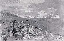 Wilberg's last major project was a great panorama of the Baths of Caracalla which he created for the Berlin Hygiene exhibition of 1882. This last major work was incinerated when the exhibition hall caught fire and Wilberg only had time to save a few paintings and drawings. After the fire, Wilberg travelled to France in the company of Werner Ludwig Pietsch in order to paint in Sedan; on his way there, he got ill while visiting Paris. He died there shortly afterwards. In October and November 1882 a special exhibition including more than 677 of Wilberg's works was held in Berlin's National Gallery. Some of the paintings from this exhibition, Villa Mondagrone and a number of oil sketches in watercolour and pencil drawings, were transferred to the National Gallery's ownership. In 1883, the Old Masters Picture Gallery in Dresden was presented with Memento Mori, one of Wilberg's motifs of the Sabini Mountains in Italy.[1]