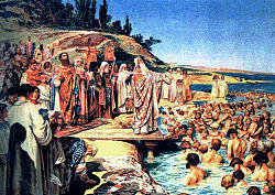 Christianization (or Christianisation) is the conversion of individuals to Christianity or the conversion of entire groups at once. Various strategies and techniques were employed in Christianization campaigns from Late Antiquity and throughout the Middle Ages. Often the conversion of the ruler was followed by the compulsory baptism of his subjects, often resulting in genocide and ethnic cleansing of whole nations such as the Old Prussians. Some were evangelization by monks or priests, organic growth within an already partly Christianized society, or by campaigns against paganism such as the conversion of pagan temples into Christian churches or the condemnation of pagan gods and practices. There is a long history of connecting Christianization and colonialism.[1] A strategy for Christianization was Interpretatio Christiana – the practice of converting native pagan practices and culture, pagan religious imagery, pagan sites and the pagan calendar to Christian uses, due to the Christian efforts at proselytism (evangelism) based on the Great Commission.