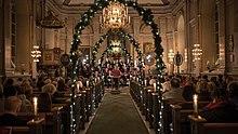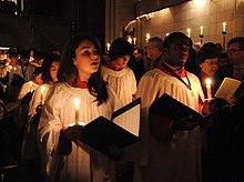 The Victorian Era saw a surge of Christmas carols associated with a renewed admiration of the holiday, including "Silent Night", "O Little Town of Bethlehem", and "O Holy Night". The first Christmas songs associated with Saint Nicholas or other gift-bringers also came during 19th century, including "Up on the Housetop" and "Jolly Old St. Nicholas".[10] Many older Christmas hymns were also translated or had lyrics added to them during this period, particularly in 1871 when John Stainer published a widely influential collection entitled "Christmas Carols New & Old".[10] William Sandys's Christmas Carols Ancient and Modern (1833), contained the first appearance in print of many now-classic English carols, and contributed to the mid-Victorian revival of the holiday.[11] Singing carols in church was instituted on Christmas Eve 1880 (Nine Lessons and Carols) in Truro Cathedral, Cornwall, England, which is now seen in churches all over the world.[12]