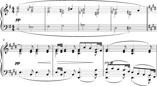 An illustration of the contrast between chromatic and diatonic harmony may be found in the slow movement of Beethoven's Piano Concerto No. 4, Op. 58. The long, flowing melody of the first five bars is almost entirely diatonic, consisting of notes within the scale of E minor, the movement's home key. The only exception is the G sharp in the left hand in the third bar. By contrast, the remaining bars are highly chromatic, using all the notes available to convey a sense of growing intensity as the music builds towards its expressive climax.
