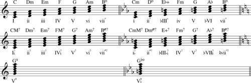 - ^ This is because the third of the triad does not belong to the natural minor scale or Aeolian mode of C minor (C, D, E♭, F, G, A♭, B♭). This highly restrictive interpretation is effectively equivalent to the idea that diatonic triads are those drawn from the notes of the major scale alone, as this source rather roughly puts it: "Diatonic chords are wholly contained within a major scale."[32]