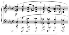 In music, a chromatic fourth, or passus duriusculus,[2] is a melody or melodic fragment spanning a perfect fourth with all or almost all chromatic intervals filled in (chromatic line). The quintessential example is in D minor with the tonic and dominant notes as boundaries, :