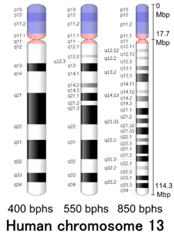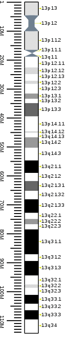 - ^ Dunham A, Matthews LH, Burton J, Ashurst JL, Howe KL, Ashcroft KJ, et al. (2004). "The DNA sequence and analysis of human chromosome 13". Nature. 428 (6982): 522–8. Bibcode:2004Natur.428..522D. doi:10.1038/nature02379. PMC 2665288. PMID 15057823.
