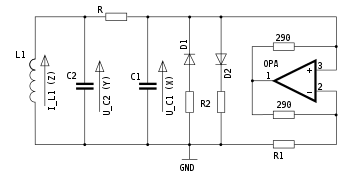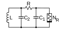 Chua's circuit is the simplest electronic circuit meeting these criteria.[3] As shown in the top figure, the energy storage elements are two capacitors (labeled C1 and C2) and an inductor (labeled L; L1 in lower figure).[4] A "locally active resistor" is a device that has negative resistance and is active (it can amplify), providing the power to generate the oscillating current. The locally active resistor and nonlinearity are combined in the device NR, which is called "Chua's diode". This device is not sold commercially but is implemented in various ways by active circuits. The circuit diagram shows one common implementation. The nonlinear resistor is implemented by two linear resistors and two diodes. At the far right is a negative impedance converter made from three linear resistors and an operational amplifier, which implements the locally active resistance (negative resistance).
