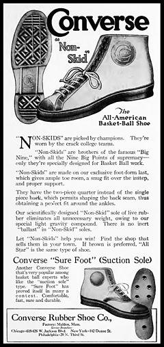 Marquis Mills Converse founded the Converse Rubber Shoe Company in 1908 in Malden, Massachusetts. In 1917 the company designed the forerunner of the modern All Star shoe that it marketed under the name of "Non-Skids." The shoe was composed of a rubber sole and canvas upper and was designed for basketball players.