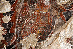 The middle region (sometimes referred to as 'antap), where humans and spirits of this world live and where shamans could travel in vision quests, is interconnected with the lower world (C'oyinahsup) through the springs and marsh areas and is connected to the upper world through the mountains. In the lower world live snakes, frogs, salamanders. The world trembles or has earthquakes when the snakes which support the world writhe. Water creatures are also in contact with the powers of the lower world and "were often depicted in rock art perhaps to bring more water to the Chumash or to appease underworld spirits' at times of hunger or disease." Itiashap is the home of the First People. Alapay is the upper world in Chumash cosmology where the "sky people" lived, who play an important role in the health of the people. Principle figures of the sky world include the Sun, the Moon, Lizard, Sky Coyote, and Eagle. The Sun is the source of life and is also "a source of disease and death."[41]