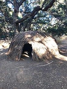Before contact with Europeans, coastal Chumash relied less on terrestrial resources than they did on maritime; vice versa for interior Chumash.[26] Regardless, they consumed similar land resources. Like many other tribes, deer were the most important land mammal the Chumash pursued; deer were consumed in varying amounts across all regions, which cannot be said for other terrestrial animals. Interior Chumash placed greater value on the deer, to the extent that they had unique hunting practices for them. They dressed as deer and grazed alongside the animals until the hunters were in range to use their arrows.[26] Even Chumash close to the ocean pursued deer, though in understandably fewer numbers, and what more meat the villages needed they acquired from smaller animals such as rabbits and birds. Plant foods composed the rest of Chumash diet, especially acorns, which were the staple food despite the work needed to remove their inherent toxins. They could be ground into a paste that was easy to eat and store for years.[27] Coast live oak provided the best acorns; their mush would be served usually unseasoned with meat and/or fish.[28]