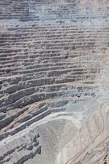 "Chuquicamata clearly belongs to the broad class of porphyry copper deposits. Practically the entire Chuquicamata orebody is hosted by the Chuqui Porphyry Complex, made up of East, Fine Texture, West and Banco porphyries." These Cu-Mo porphyry systems formed during the Eocene-Oligocene and exhibit classic "zoned alteration-mineralization features." A regional fault zone gave rise to hydrothermal activity which concentrated metal and sulfide minerals. The West Fault is a major fault that separates Chuquicamata into two parts, west and east. This fault is part of the Cenozoic West Fault System in Chile extending several hundred km in a general north-south to northeast strike direction. The Chuqui Porphyry Complex lies in the mineralized east part of the pit while the barren Fortuna Complex lies in the west part. "a large proportion of the copper at Chuquicamata occurs in veins and veinlets filling faults and fault-related shatter zones." "Pyrite is present everywhere" and chalcocite and covellite appear as both supergene and hypogene minerals. "Molybdenite is conspicuous at Chuquicamata, almost all of it carried by quartz veins."[5]
