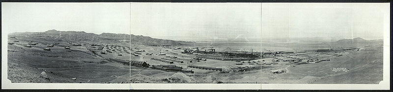 Chilex then went ahead with the development and construction of a mine on the eastern section of the Chuquicamata field. (It acquired the remainder of the field gradually over the next 15 years). The 10,000 tons per day leaching plant was planned to produce 50,000 tons of electrolytic copper annually. Amongst the equipment purchased were steam shovels from the Panama Canal.[2][16] A port and an oil-fired power plant were built at Tocopilla, 140 km (90 mi) to the west and an aqueduct was constructed to bring water in from the Andes.[17] Production started on May 18, 1915. Actual production rose from 4,345 tonnes in the first year to 50,400 tonnes in 1920 and 135,890 tonnes in 1929 before the Depression hit and demand fell.[18]