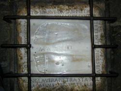 The two footprints on a marble slab at the center of the church — nowadays a copy of the original, which is kept in the nearby Basilica of San Sebastiano fuori le mura — are popularly held to be a miraculous sign left by Jesus. It is to these footprints that the official name of the church alludes: palmis refers to the soles of Jesus' feet. It is likely that these footprints are actually the draft of an ancient Roman "ex voto", a tribute paid to the gods for the good outcome of a journey.