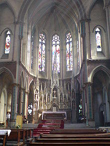 The Church of the Holy Name of Jesus on Oxford Road, Manchester, England was designed by Joseph A. Hansom and built between 1869 and 1871.[2] The tower, designed by Adrian Gilbert Scott, was erected in 1928 in memory of Fr Bernard Vaughan, SJ. The church has been Grade I listed on the National Heritage List for England since 1989, having previously been Grade II* listed since 1963.[3]