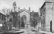 The lands for the church were given by the Honourable John Simcoe Macaulay in 1845. Macaulay's cottage, 'Teraulay' was then situated on an estate named Macaulay's Fields which extended from present day Yonge to Bay (then known as Teraulay) Streets, and from today's Albert Street (then known as Jeremy Street) to just south of Dundas Street. Building lots filled in the edges of the property to the north, south, and west of the Trinity site, and the central portion of the property was donated for the construction of the church. Eventually the east side of the Trinity site was sold to permit retail frontage on Yonge Street, enclosing Trinity Church, although a roadway connected Trinity to Yonge Street.[2] The building was dedicated on October 27, 1847.[3]