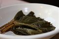 Chwinamul (취나물) is a fragrant leaf vegetable with heart-shaped serrated leaves that grows in the mountains and fields of Korea. The word chwinamul in its strict sense refers only to chamchwi (참취, "edible aster"), literally translated as "true chwi". However, there are about a hundred varieties of chwinamul that grow naturally in Korea, including sixty-odd edible varieties.[1] Among them, gomchwi (곰취, "Fischer's ragwort"), gaemichwi (개미취, "Tatarinow's aster"), miyeokchwi (미역취, "Asian goldenrod"), surichwi (수리취, "deltoid synurus"), matari (마타리, "golden lace"), and gaksichwi (각시취, "maiden saussurea") are the most eaten varieties.