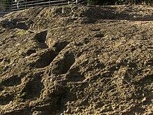 Until the discovery of the Happisburgh footprints in England in 2013, they were the oldest known hominid footprints outside Africa.[3] The tracks were originally dated to between 385,000 and 325,000 years ago,[1] but subsequent studies using argon–argon dating placed the date more precisely as around 349–350,000 years ago. The pyroclastic deposits in which the footprints were imprinted were laid down around 349,000 years ago (±3,000 years), while the layer of volcanic ash which subsequently covered and preserved them was deposited around 350,000 years ago (±3,000 years). The footprints are thought to have been exposed by erosion caused by heavy precipitation and landslides in the early 19th century, when the name Ciampate del Diavolo was first recorded.[4]
