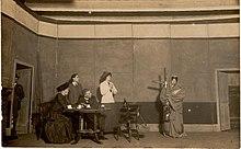 In the days before radio, one effective way to get a message out into society and to have it discussed was to produce short plays that could be performed around the country, and so suffrage drama was born. Elizabeth Robins's Votes for Women and Cicely Hamilton and Christopher St. John's How the Vote Was Won are two predominant examples of the genre.[7] Hamilton also wrote A Pageant of Great Women, a highly successful women's suffrage play based on the ideas of her friend, the theatre director Edith Craig. Hamilton played Woman while Craig played the painter Rosa Bonheur, one of the 50 or so great women in the play.[8] Lena Connell's photographs of the leading players were sold to assist the suffrage cause and Connell exhibited the pictures at the Royal Photographic Society in 1910/11.[9] The play was produced all over the UK from 1909 until the First World War.[8] Hamilton was a member of Craig's theatre society, the Pioneer Players. Her play Jack and Jill and a Friend was one of the three plays in the Pioneer Players' first production in May 1911.[10] Hamilton inspired young schoolgirls, supportive of suffrage, like Winifred Starbuck, who had Hamilton and other leaders pictures on her desk in purple white and green frames and later herself protested in school disorder such as graffiti and hiding the school registers and handbell, a milder form of resistance to authority for women's suffrage.[6]