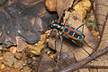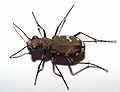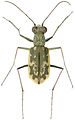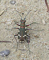Cicindela, commonly known as common tiger beetles[1] are generally brightly colored and metallic beetles, often with some sort of patterning of ivory or cream-colored markings. They are most abundant and diverse in habitats very often near bodies of water with sandy or occasionally clay soils; they can be found along rivers, sea and lake shores, sand dunes, around dry lakebeds, on clay banks, or woodland paths.