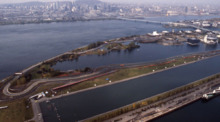 The race circuit is on Notre Dame Island, a man-made island in the St. Lawrence River most of which was originally built up for the Expo in 1967. Saint Helen's Island to the northwest was artificially enlarged for the Expo '67 fairgrounds and a prominent remnant of the fair, the Biosphere can be regularly seen during television coverage of racing events. Almost half of the track – from the hairpin turn until after the pit area – runs alongside the Olympic Basin, a huge rectangular basin which was created for the rowing and canoeing events of Montréal's 1976 Summer Olympics.