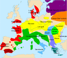Archaeological cultures in Neolithic Europe of the late 5th millennium. The Central European cultures associated with roundels (Lengyel, Stroked Pottery, Rössen) are indicated in yellow