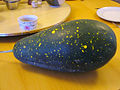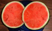 The large fruit is a kind of modified berry called a pepo with a thick rind (exocarp) and fleshy center (mesocarp and endocarp).[4] Wild plants have fruits up to 20 cm (8 in) in diameter, while cultivated varieties may exceed 60 cm (24 in). The rind of the fruit is mid- to dark green and usually mottled or striped, and the flesh, containing numerous pips spread throughout the inside, can be red or pink (most commonly), orange, yellow, green or white.[5][6]