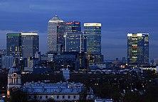 The City is a major business and financial centre,[9] and the Bank of England is headquartered in the City. Throughout the 19th century, the City was the world's primary business centre, and it continues to be a major meeting point for businesses.[10] London came top in the Worldwide Centres of Commerce Index, published in 2008. The insurance industry is focused around the eastern side of the City, around Lloyd's building. A secondary financial district exists outside the City, at Canary Wharf, 2.5 miles (4 km) to the east.