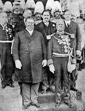 In 1909, Díaz and William Howard Taft planned a summit in Ciudad Juárez and El Paso, a historic first meeting between a Mexican and a U.S. president, and also the first time a U.S. president would cross the border into Mexico.[10] But tensions rose on both sides of the border over the disputed Chamizal strip connecting Ciudad Juárez to El Paso, even though it would have been considered neutral territory with no flags present during the summit.[11] The Texas Rangers, 4,000 U.S. and Mexican troops, U.S. Secret Service agents, FBI agents and U.S. marshals were all called in to provide security.[12] Frederick Russell Burnham, the celebrated scout, was put in charge of a 250 private security detail hired by John Hays Hammond.[13][14] On October 16, the day of the summit, Burnham and Private C.R. Moore, a Texas Ranger, discovered a man holding a concealed palm pistol standing at the El Paso Chamber of Commerce building along the procession route.[15][16] Burnham and Moore captured, disarmed, and arrested the assassin within only a few feet of Díaz and Taft.[17][18]