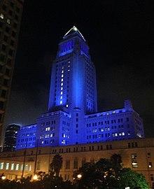 Los Angeles City Hall stands at the southern border of the Los Angeles Civic Center. | |