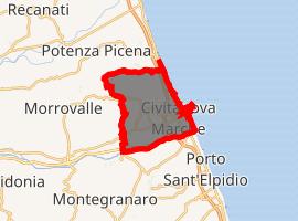 Civitanova Marche borders the municipalities: Montecosaro, Porto Sant'Elpidio, Potenza Picena and Sant'Elpidio a Mare.[4] It counts the hamlets (frazioni) of Civitanova Alta, Fontespina, Maranello, Risorgimento, San Marone and Santa Maria Apparente.