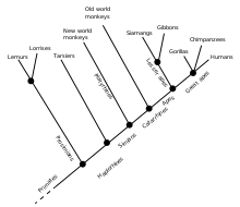 - A clade A is basal to a clade B if A branches off the lineage leading to B before the first branch leading only to members of B. In the adjacent diagram, the strepsirrhine/prosimian clade, is basal to the hominoids/ape clade. However, in this example, both Haplorrhine as prosimians should be considered as most basal groupings. It is better to say that the prosimians are the sister group to the rest of the primates.[15] This way one also avoids unintended and misconceived connotations about evolutionary advancement, complexity, diversity, ancestor status, and ancienity e.g. due to impact of sampling diversity and extinction.[15][16] Basal clades should not be confused with stem groupings, as the latter is associated with paraphyletic or unresolved groupings.