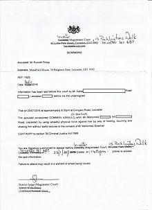 A summons issued by the Leicester Magistrates' Court against Russell Finlay for a charge of common assault by beating. Signed by District Judge (Magistrates' Courts) Sally Fudge. This is a summons for a private prosecution.