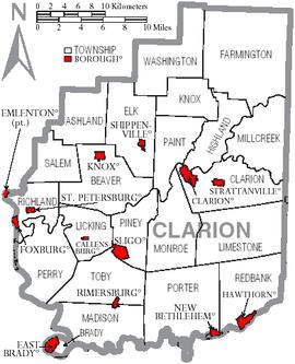 Under Pennsylvania law, there are four types of incorporated municipalities: cities, boroughs, townships, and, in at most two cases, towns. The following boroughs and townships are located in Clarion County:
