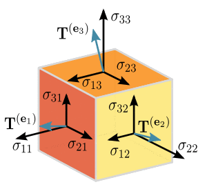 If a particular surface element inside the material is singled out, the material on one side of the surface will apply a force on the other side. In general, this force will not be orthogonal to the surface, but it will depend on the orientation of the surface in a linear manner. This is described by a tensor of type (2, 0), in linear elasticity, or more precisely by a tensor field of type (2, 0), since the stresses may vary from point to point.