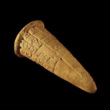 Used by Sumerians and other Mesopotamian cultures beginning in the third millennium BC, clay nails, also referred to as dedication or foundation pegs, cones, or nails, were cone-shaped nails made of clay, inscribed with cuneiform, baked, and stuck into the mudbrick walls to serve as evidence that the temple or building was the divine property of the god to whom it was dedicated.[1] Versions were also made of metal, including castings with figurative designs,[2] such as the Hurrian foundation pegs (Syria, c. 2300 – c. 2159 BCE).