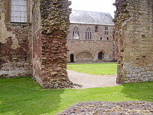 To the south of the church a cloister was laid out, surrounded by the domestic buildings of the house. The east range, which was completed first (probably by around 1250),[5] held the chapter house, sacristy, the monks' dormitory, day room, and a 19.7 metres (65 ft) long reredorter (latrine).[6] The south range was built next, it contained the kitchens, warming house and refectory which projected south beyond the main body of the building, following the usual Cistercian plan.[7]