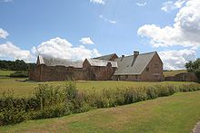 The monastery, which is next to the River Washford,[11] would have been surrounded by gardens, fishponds, orchards, barns, guesthouses, stables, a farmyard and industrial buildings. The abbey grounds were defended by a water filled moat and a gatehouse.[5] Excavation has revealed that a large stone cross, like a market cross, stood just west of the main building.[6]